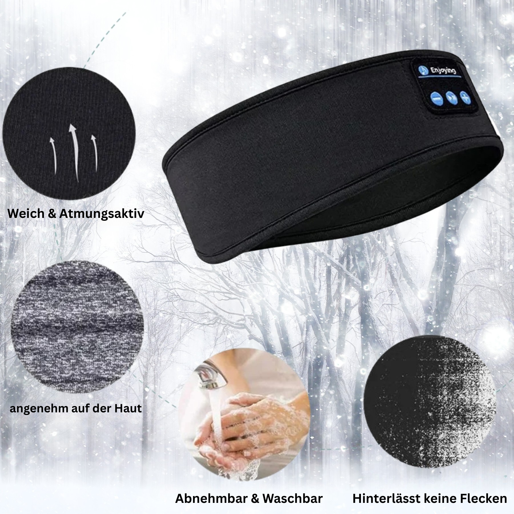 Das EnjoyVibe SoundBand wurde für aktive Menschen entwickelt – es bleibt fest sitzen, hält warm und sorgt für klare Musik, auch bei Bewegung oder Kälte.